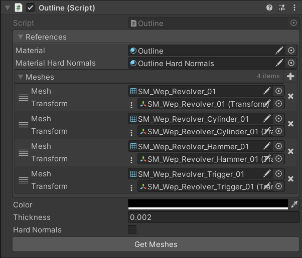 Finally to streamline the setup of the outline I added a method that finds all meshes in the GameObject's children and adds them to the OutlineData array. This method is triggered by the "Get Meshes" button and is called in the Reset() method so that is automatically finds meshes when you add the script to a GameObject.