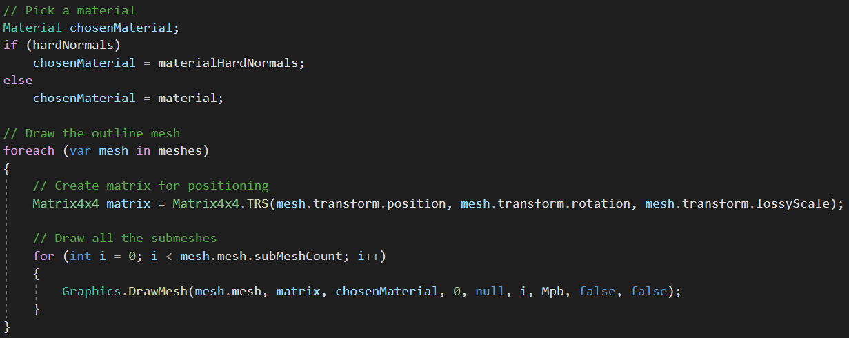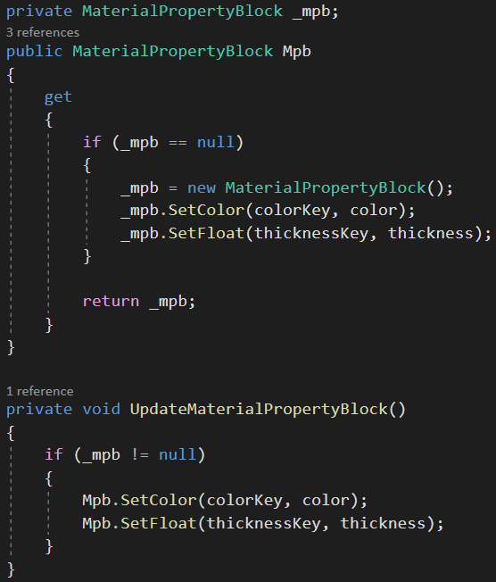 Besides drawing a mesh with the outline material the script also allows the user to change the properties of the outline in the inspector. To implement this I used a Material Property Block that gets updated whenever a value is changed in the inspector.